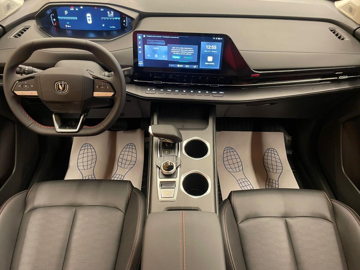 Changan UNI-S (CS55 Plus) 2024 года — современный внедорожник с пятидверным кузовом, который подойдёт как для городских поездок, так и для путешествий за город. Автомобиль оснащён бензиновым двигателем объёмом 1,5 литра и мощностью 181 лошадиная сила, а роботизированная коробка передач обеспечивает плавное переключение скоростей. Белый цвет кузова и лаконичный дизайн придают машине сдержанный и стильный вид. В салоне — комбинированная обивка, эргономичные сиденья с электрорегулировкой: водительское и пассажирское сиденья регулируются по высоте. Мультифункциональное рулевое колесо с кожаной отделкой и отделка кожей рычага КПП добавляют комфорта при управлении. Также есть передний центральный подлокотник и третий задний подголовник. Декоративная подсветка салона создаёт уютную атмосферу. Практичность модели подчёркивают многочисленные опции, которые сделают каждую поездку комфортнее: * климат-контроль; * подогрев всех сидений; * электростеклоподъёмники; * обогрев зеркал и лобового стекла; * электрорегулировка и электроскладывание зеркал. Безопасность движения обеспечивают: * антиблокировочная система тормозов (ABS); * система курсовой стабилизации (ESP / ESC / DSC / VSA); * антипробуксовочная система (ASR / TCS / TRC); * подушки безопасности (водителя, пассажира, боковые и оконные шторки); * система контроля за полосой движения; * система предотвращения столкновения; * система помощи при торможении; * система помощи при старте в гору; * датчик давления в шинах; * парктроник задний; * камеры (360 и заднего вида). Дополнительные удобства предоставляют: * дистанционный запуск двигателя и запуск с кнопки; * система доступа без ключа; * электропривод крышки багажника; * голосовое управление; * бортовой компьютер; * адаптивный круиз-контроль; * датчики дождя и света. Для подключения мобильных устройств предусмотрены беспроводная зарядка, розетка 12V, поддержка Android Auto, Bluetooth, CarPlay и USB. Рейлинги на крыше и панорамная крыша дополняют внешний вид автомобиля и расширяют его функциональность.